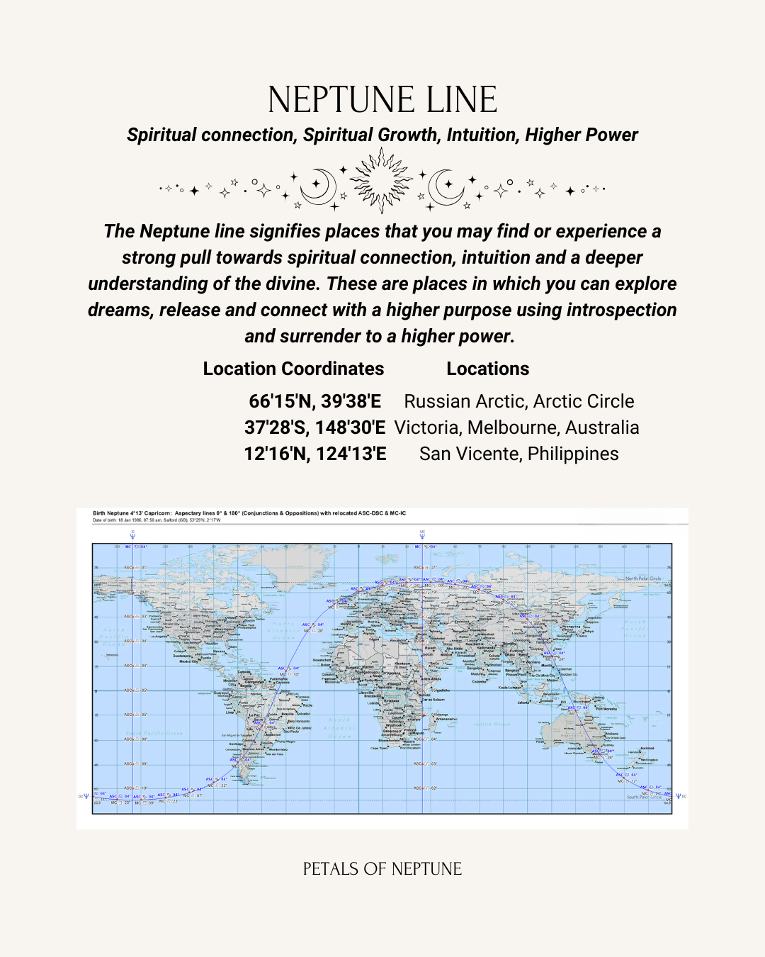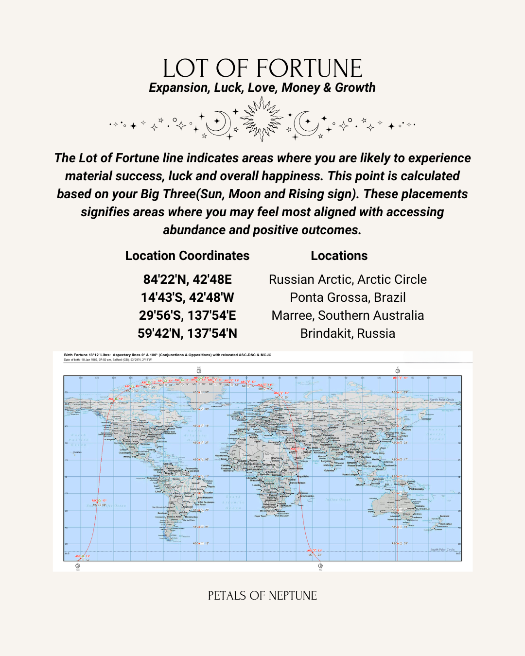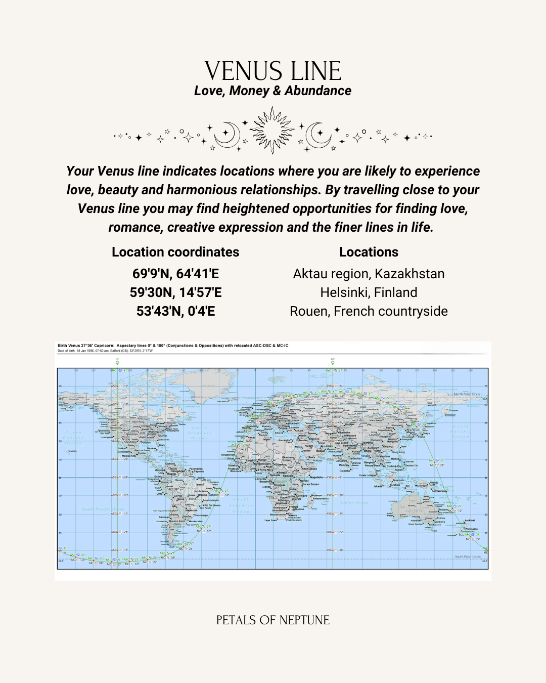 In this personalised Astrocartography reading, I will explore the unique energetic blueprint that influences your relationships, career and life path. By mapping the celestial bodies at the exact time and place of birth, we'll uncover the hidden connections between your inner world and the outer world. Get ready to gain profound in sights into locations around the world that hold specific energetic resonance within your birth chart. These locations are thought to amplify or trigger certain themes, patterns, and energies in a person's life. By understanding these locations, you can gain insight into the underlying forces that shape your experiences, relationships, and life path.