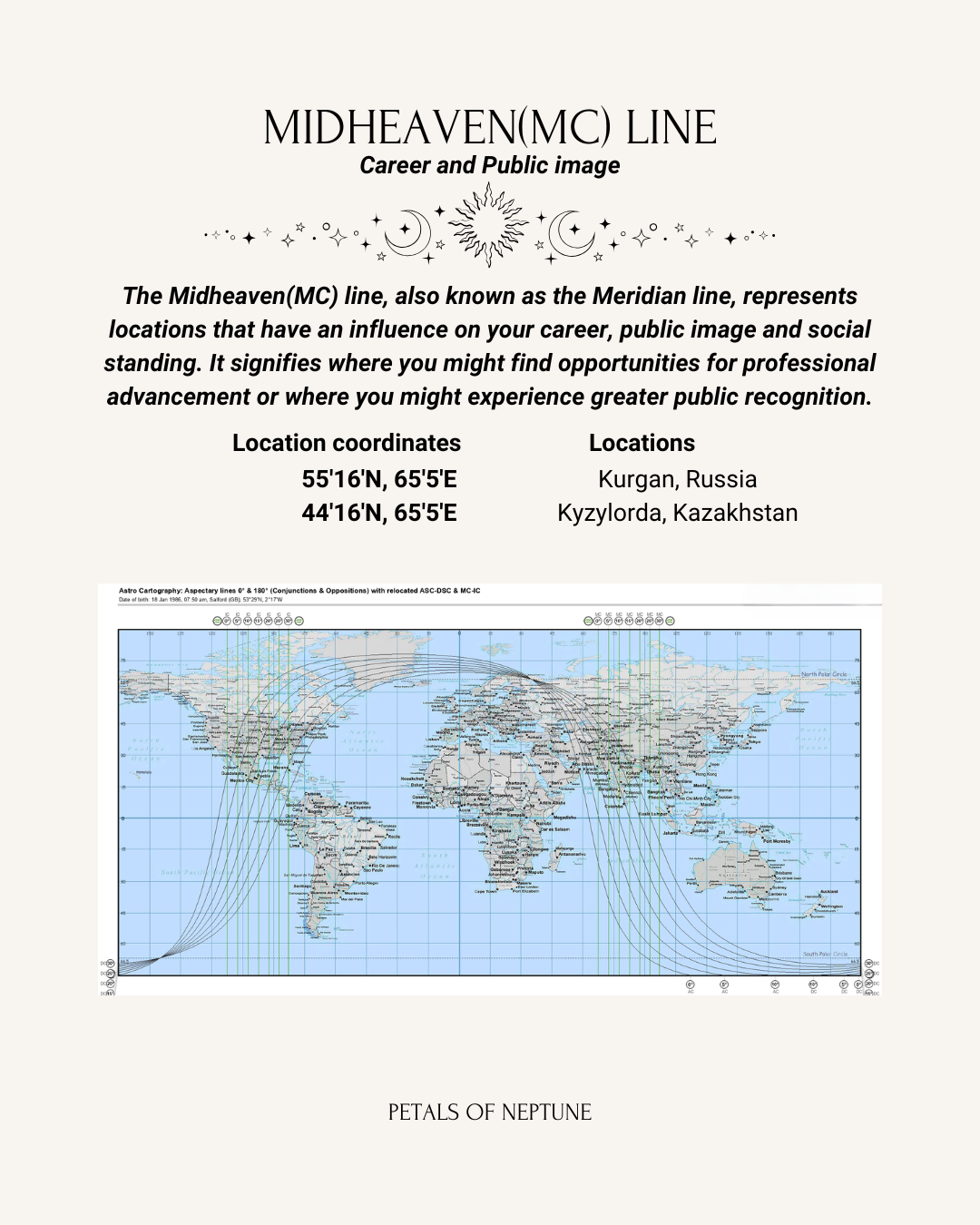 For example, a location might be associated with your Sun line, which could indicate a sense of identity, creativity, and self-expression. Another location might be connected to your Moon line, which could influence your emotional landscape, relationships, and sense of security.